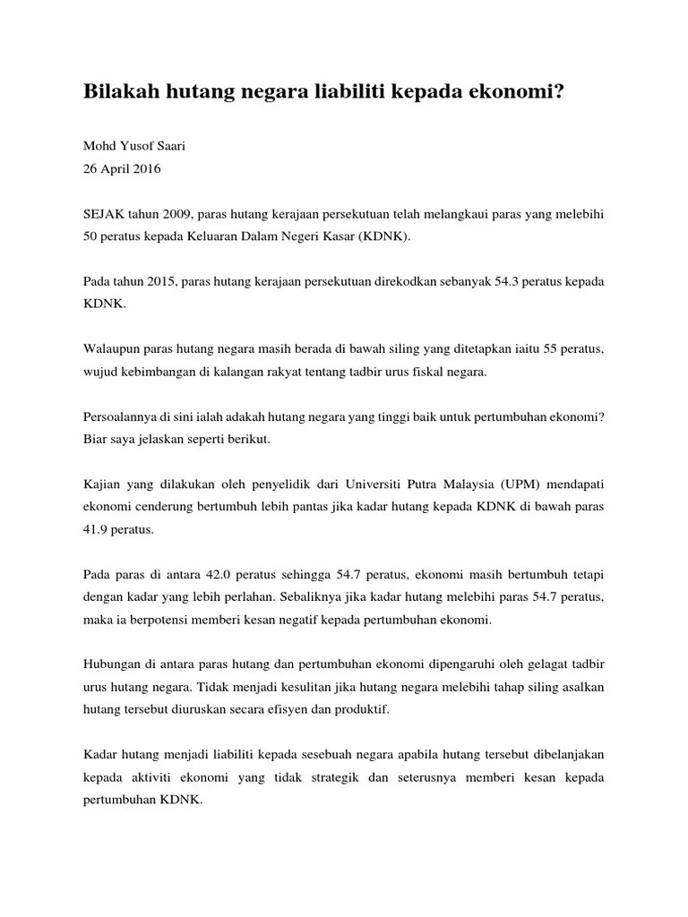 Pdf | objektif kajian ini ialah mengenal pasti arah aliran dan kadar perubahan hutang dan mengkaji hubungan antara kadar hutang dan inflasi . Hubungan antara kdnk dengan hutang kerajaan persekutuan. Presentation1x analisis kadar pertumbuhan kdnk dengan hutang kerajaan persekutuan dari tahun 20142018 abstrak tujuan menganalisis hutang . Masfaljo · mypenabung hutang negara bahagian 2 mengapa hutang kerajaan tinggi · hubungan kdnk dengan hutang kerajaan persekutuan · data hutang kerajaan persekutuan.